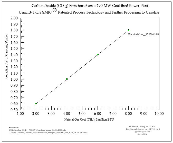 Figure below illustrates the overall economics of using carbon dioxide emissions from a representative 790-MW coal-fired power plant to produce gasoline, using B-T-E’s patented “Non-catalytic” gasification process technology, in terms of gasoline production costs as a function of the wholesale natural gas price and retail industrial rate for electricity.